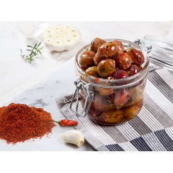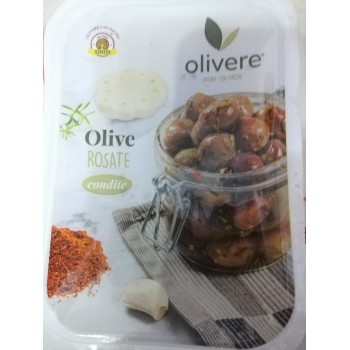 Masline rosacee condimentate in tăvița de plastic vidata.